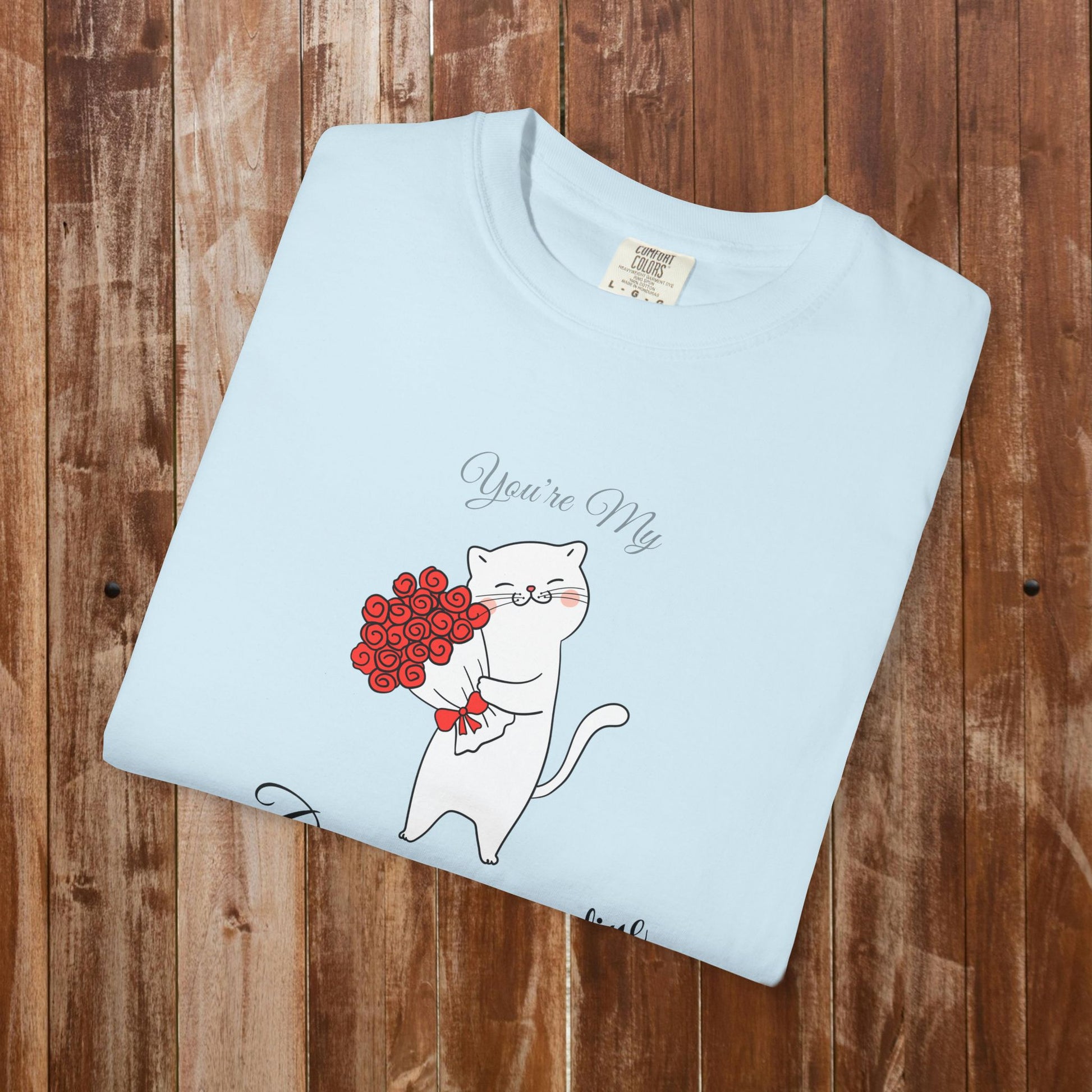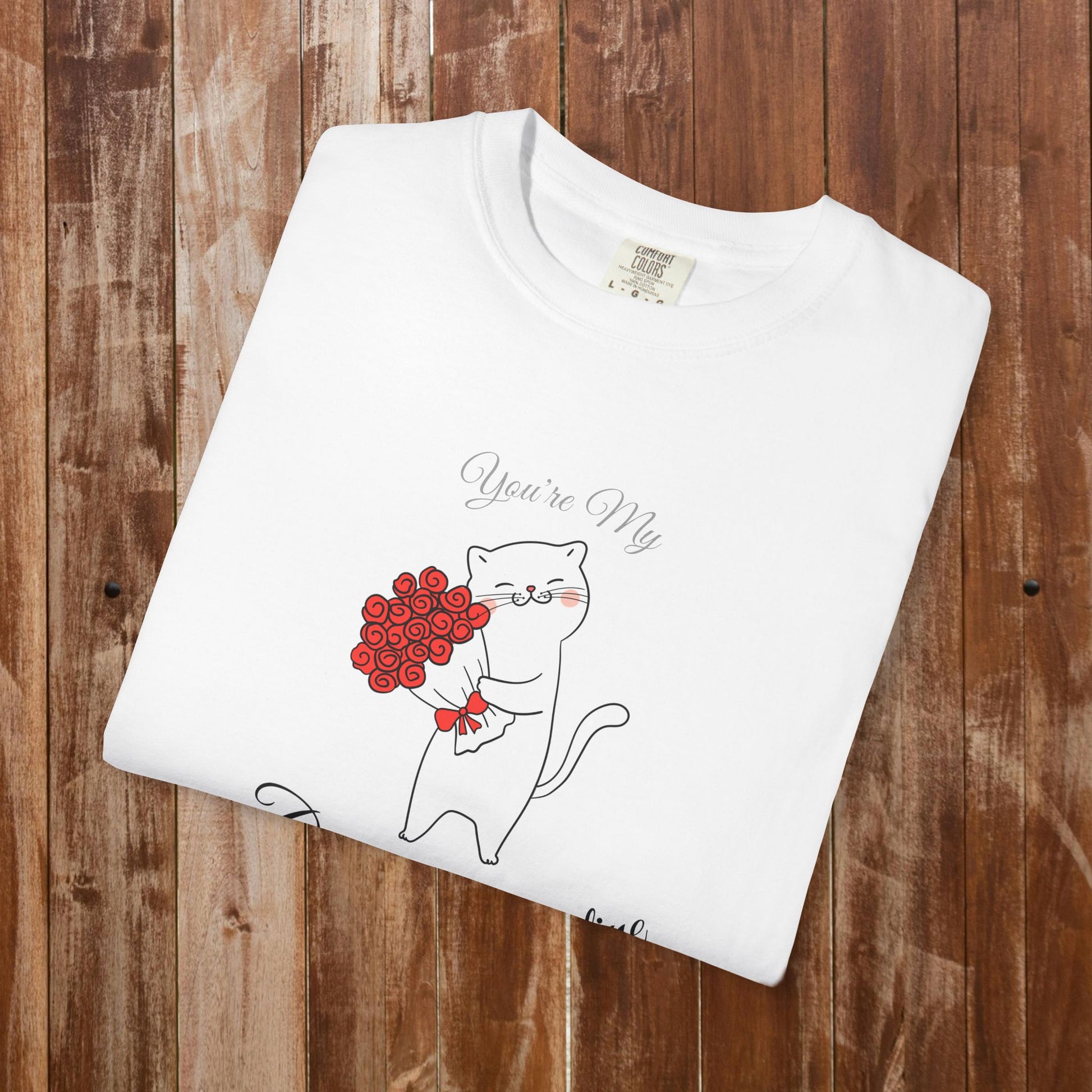 Some valentines bring chocolates. Some bring flowers. But the best valentine? The one who brings roses AND understands your love for cats. This t-shirt features an elegant white cat standing upright, holding a beautiful bouquet of red roses, with the sweet message "You're My Purrfect Valentine" β because the perfect valentine speaks your love language: cats and romance combined.
